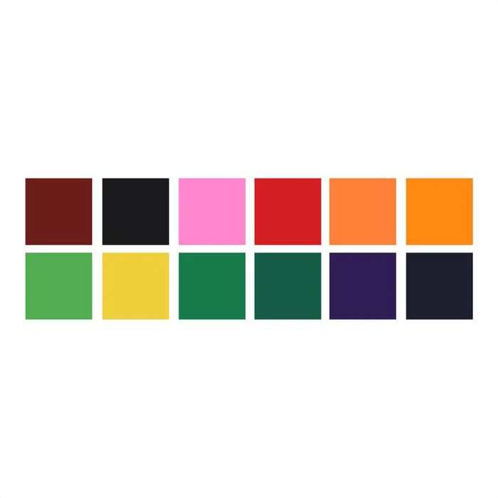 Farbvarianten: braun, schwarz, rosa, rot, lachs, orange, gelb, hellgrün, tannengrün, dunkelgrün, violett, dunkelblau