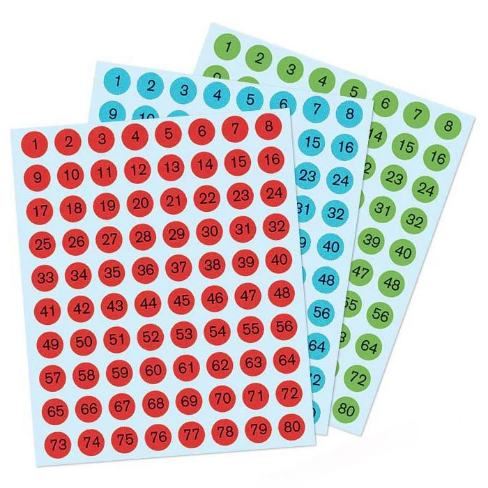 sonstiges: selbstklebend, permanent, konturgestanzt, auf farbigen Kreisen (rot, blau, grün)