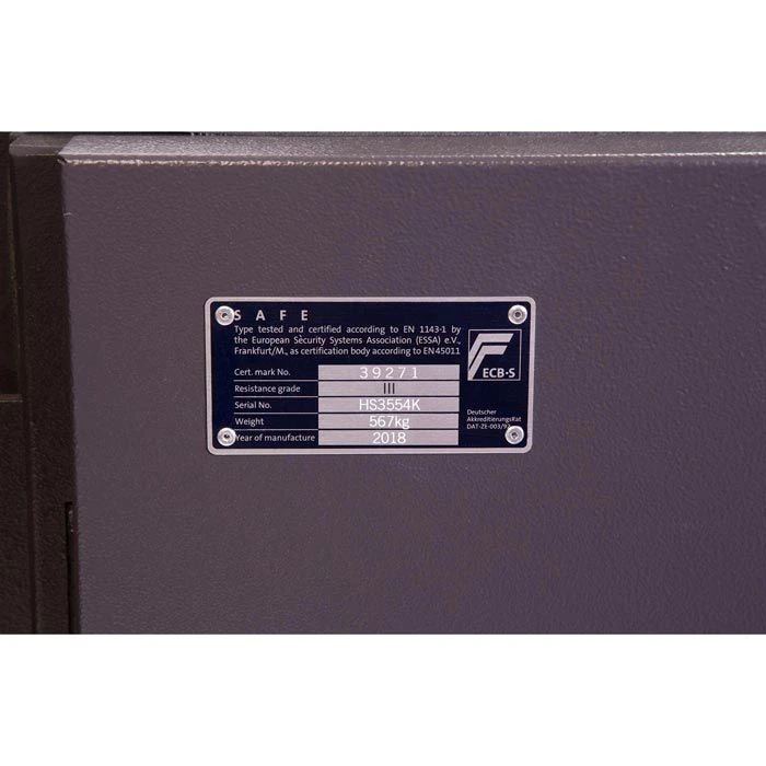 sonstiges: Feuerschutz-Zertifikat nach EN15659 ECB.S LFS30P, Versicherungsschutz bis 200.000,-€ (privat) bzw. 100.000,-€ (gewerblich) möglich, Hochsicherheitsschloss der VdS-Schlossklasse 2, dreiseitige Verriegelung durch 100 x 10 mm starke Flachriegelbolzen, doppelwandige Konstruktion, gefüllt mit hoch widerstandsfähigen Verbundmaterialien, verstärkt durch Bohrschutzplatten und Notverriegelungsmechanismen in der Tür, Türöffnungswinkel 180° durch außenliegende Bänder, herausnehmbare Fachböden, geeignet für die Aufbewahrung von Dokumenten aus Papier und Wertgegenständen, sowie Speichermedien, zugelassen als Betäubungsmittel-Tresor und für die Aufbewahrung von Handfeuerwaffen, entspricht §36 des Deutschen Waffengesetzes